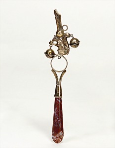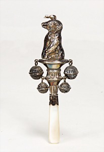 Rassel, silber, Griff Stein, Eichhörnchen, mit Pfeife, 16,5 cm