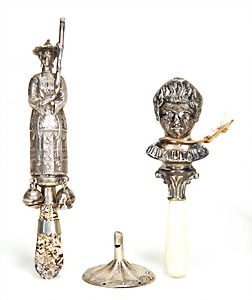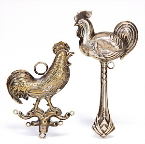 2 Teile, Rassel, Hahn, wohl nicht kompl., 8,5 cm, 1 Hahn, Druckstelle seitl., 10,5 cm, silber