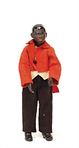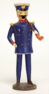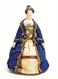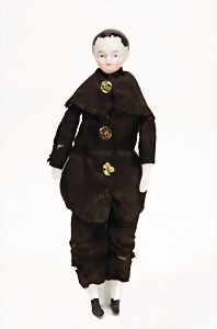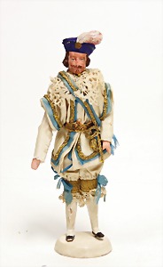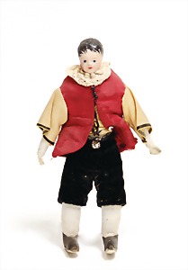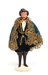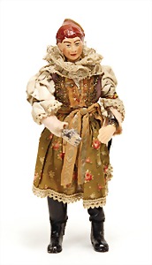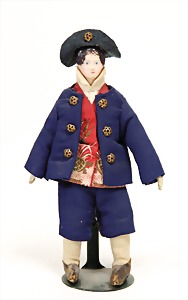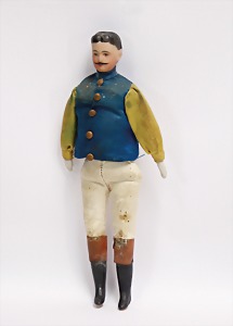 Biedermeier-Puppenstuben-Puppe, Mann mit aufgemaltem Schnurrbart, 18,5 cm, alte Kleidung
