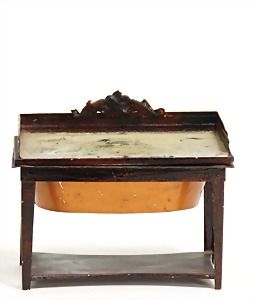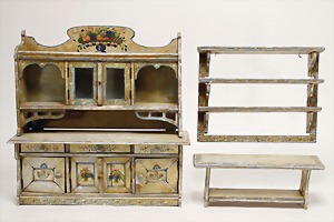 Puppenstuben-Küche, 1,51 m breit, 51 cm hoch, 54 cm tief, möbliert, reichh. Zubehör, mit Herd, sehr schönes dekoratives Ausstellungsstück, Bemalung wohl später, mit Puppe