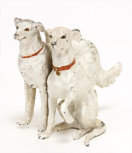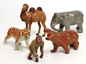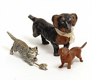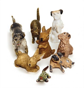 5 Teile Bronze, 3 Hunde, 1 Katze, 2,5 – 6 cm, 1 kl. Krokodil, kl. Lackfehler, guter Zust., 3 Teile Porzellan, teilw. bestoßen