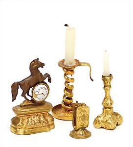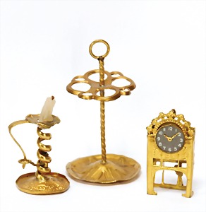 Gold/Blech, 3 Teile, Schirmständer, 7 cm, kl. Uhr, 4,5 cm, 1 Kerzenleuchter, guter Zust.