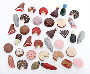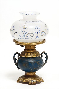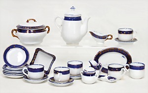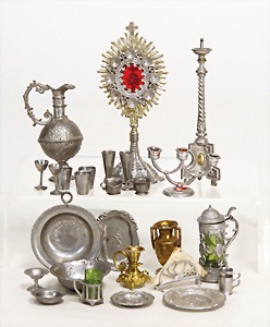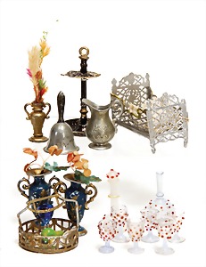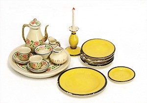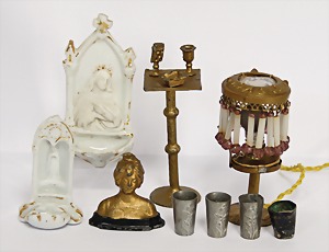 Puppenstuben-Ausschmückungsteile, 2 x sakraler Brunnen, Porzellan, 5 cm, Rauchertisch, 4 Kelche, 1 Tischlampe, kl. Tischuhr, Ziffernblatt fehlt