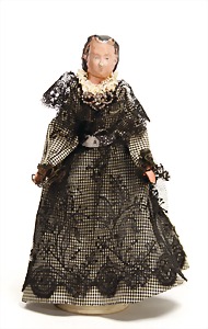 4 Teile, Puppenstuben-Puppen, 3 Damen, 14 – 14,5 cm, 1 Mann mit Schnurrbart, 15,5 cm, teilw. Füße weggebrochen, 1 Figur Arme u. Beine ergänzt, Kleidung aus alten Stoffen genäht