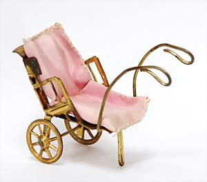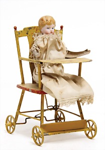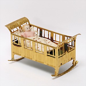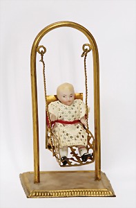 Gold/Blech, Schaukel, mit kl. Ganzbiskuit-Puppe, 3641, 13 cm, selten, guter Zust.