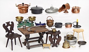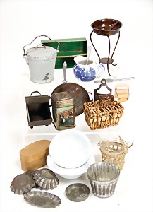 Konv. Puppenküchen-Zubehör, Bettflasche, Zinn, mit Einsatz f. Babyflasche, einige Kupferteile, Waage, Blech-, Holz- u. Gussteile, ein paar Kupferteile neuer