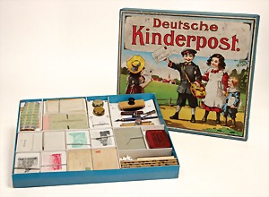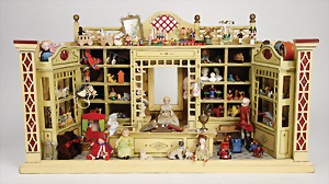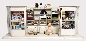 Puppenstuben-Kaufladen, eingerichtet als Spielwarengeschäft, 82 cm breit, 28 cm hoch, farbl. überarbeitet, ohne Schubladen, reichh. Zubehör, meist alt