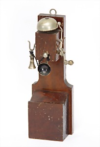 Puppenstuben-Telefon, Blech- u. Holzteile, 11,5 cm, mit Glocke u. Hörer