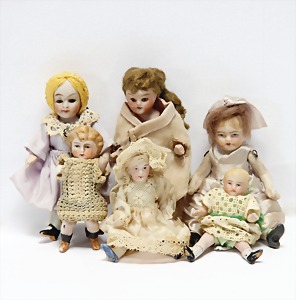 4 Puppenstuben-Puppen, 13 cm, Biskuit-Kurbelkopf, Masse-Stehkörper, Orig.-Kleidung, kl. Ganzbiskuit-Puppe, 10 cm, 2 kl. Celluloid-Puppen, Minerva