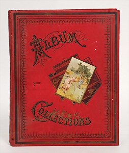 Album Collections, 53 Seiten, Oblatenbilder, Werbekarten, Soldaten, Vögel, Kinder, Blumen, Tiere, Werbekarten Liebig sowie andere, bitte besichtigen, Einband Prägedruck mit bunte, Deckbild