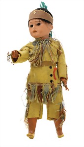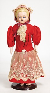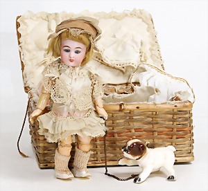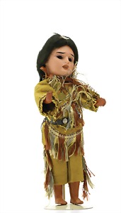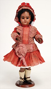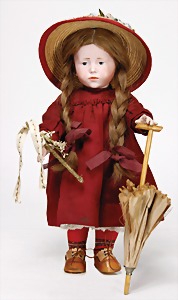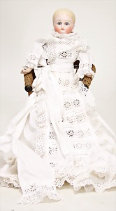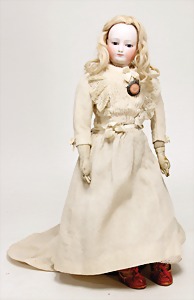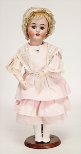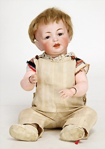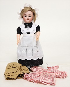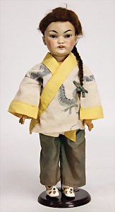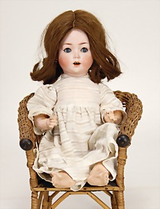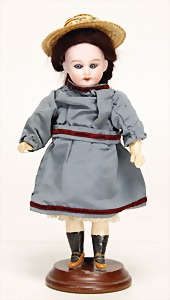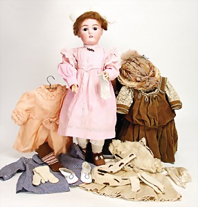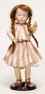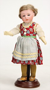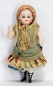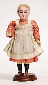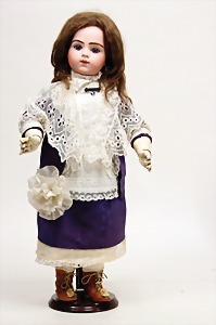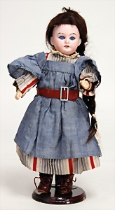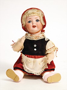 233, Biskuitporzellan-Charakterpuppe, Biskuit-Kurbelkopf, braune Schlafaugen, off. Mund, oben Zähne, Gliederkörper, Körper teilw. etwas ausgebessert, Perücke neuer, alte Kleidung