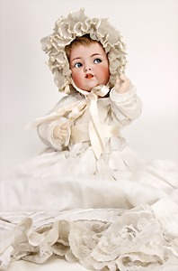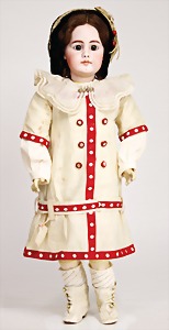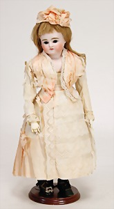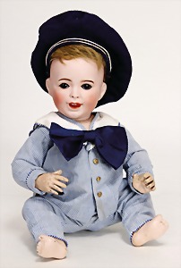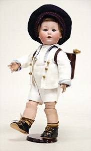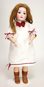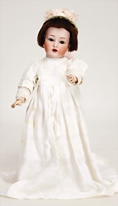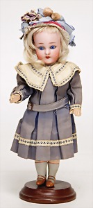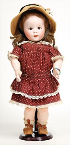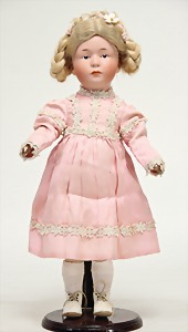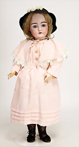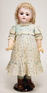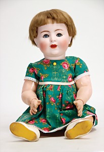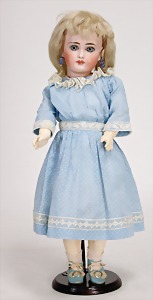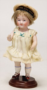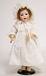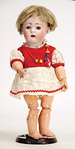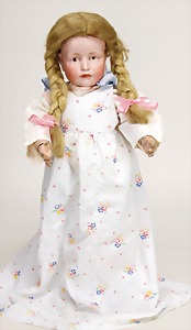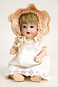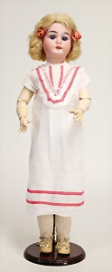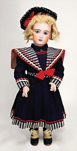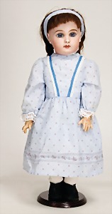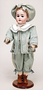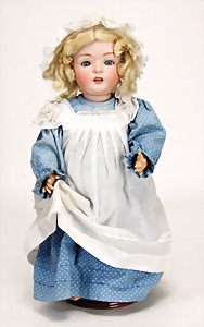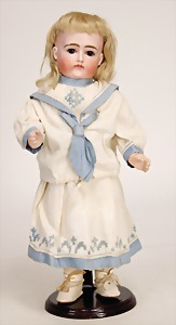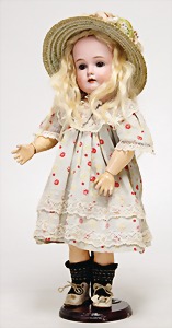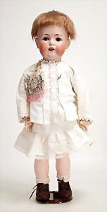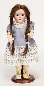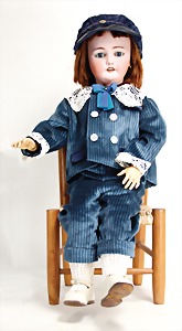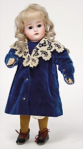 1078, 82 cm, blaue Schlafaugen, off. Mund, oben Zähne, Kinngrübchen, durchst. Ohren, Gliederkörper, Perücke neuer, Kleidung neuer, Schuhe alt