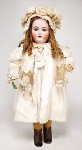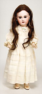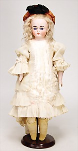 164, Biskuitporzellankopf-Puppe, 78 cm, Kurbelkopf, braune Schlafaugen, off. Mund, oben Zähne, Kinngrübchen, Gliederkörper, alte Kleidung u. Schuhe, alte Echthaarperücke, kl. Kratzer an 1 Wange, sonst gut, Orig.-Gipsdeckel wurde nicht entfernt, Transportrisiko f. Augenmechanismus beachten