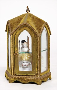 Vitrine, 23 cm, 5 geschliffene Gläser, dazu einige Brustblattköpfe