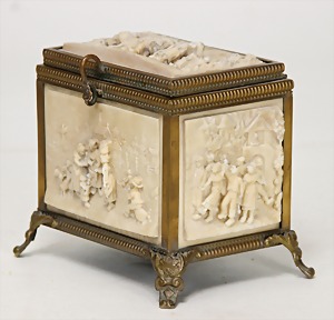 Schatulle, Messing, mit Biskuit-Bildern, oben u. seitl., Höhe 12 cm, Breite 11,5 cm, bis auf minim. Chipstellen in gute Zust.