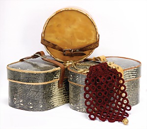 3 Hutschachteln, Pappe, 1 Tasche mit Kette 19 cm