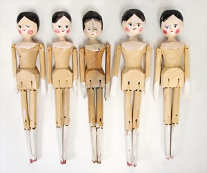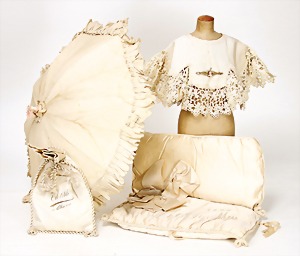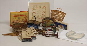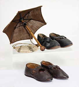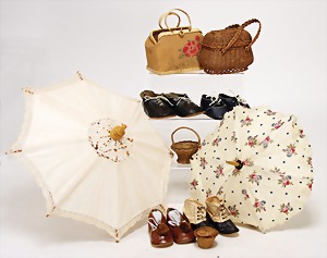 3 Paar Puppenschuhe, 1900 – 1910, ein Paar Puppenschuhe neuer, f. größere Puppen, 2 Schirme, 4 Körbe