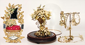 Puppendekoration, Glassturz mit Blumendeko, 36 cm, 1 Spiegeltisch mit Kissen, Gold/Blech, 44 cm, 5 Blumenkränze f. mittlere bis gr. Puppen