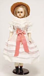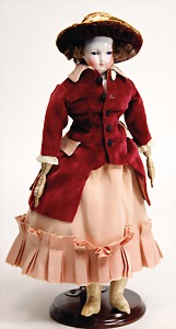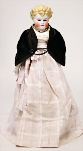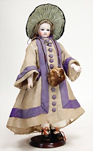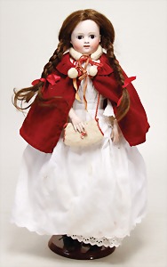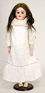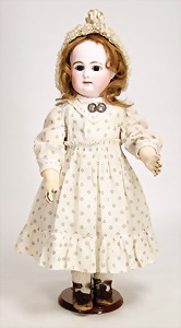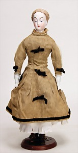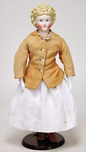 Biskuitporzellankopf-Puppe, 25 cm, nachträglich fest eingesetzte braune Glasaugen, off. Mund, oben Zähne, alte Mohairperücke, Gliederkörper, mit zusätzlicher Kleidung