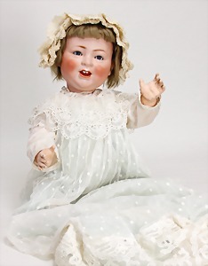 Das lachende Baby, 1930-6 ½ Made in Germany drgn, außergew. Biskuitporzellan-Charakterbaby, 56 cm, Kurbelkopf, blaue Schlafaugen, off. Mund, Zähne u. Zunge später ergänzt, ausgeformter Sitzbabykörper, mit leicht abstehendem Zeh, alte Mohairperücke, außergew. Gr.