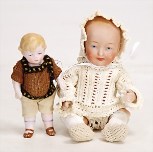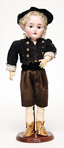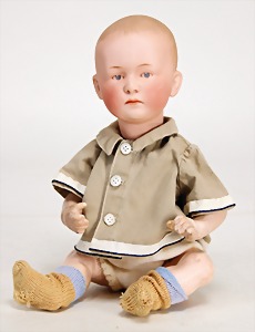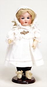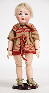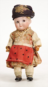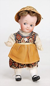 9573, Biskuitporzellan, Googly, 16,5 cm, Kurbelkopf, braune seitl. blickende Schlafaugen, geschl. Melonenmund, stämmiger Stehkörper, mit anmodellierten Schuhen u. Strümpfen, Mohairperücke ausgegangen, Orig.-Kleidung