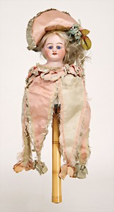 Marotte, 34 cm, Biskuit-Brustblattkopf, fest eingesetzte blaue Glasaugen, off. Mund, oben Zähne, Mohairperücke wurde nicht entfernt, von außen keine Risse erkennbar