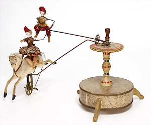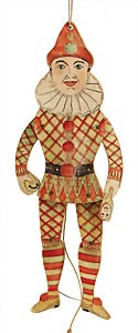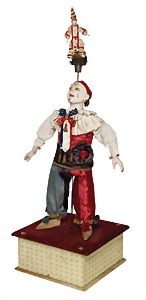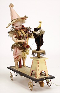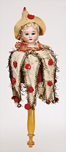 Marotte, Biskuit-Brustblattkopf, blaue fest eingesetzte Glasaugen, off. Mund, oben Zähne, 36 cm, Musikspielwerk intakt, Stoff an einigen Stellen etwas verschlissen