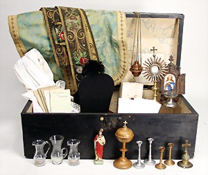 Santa, Biskuitporzellankopf-Puppe, 55 cm, Biskuit-Kurbelkopf, Mohairperücke fest aufgeklebt, wurde nicht entfernt, Transportrisiko für Augenmechanismus beachten, braune Schlafaugen, off. Mund, durchst. Ohren, Gliederkörper, alte Kleidung, Unterkleidung, Schuhe u. Strümpfe, dazu einige Teile Kleidung, aus der Zeit, teils später