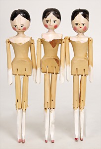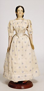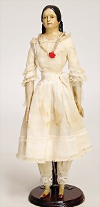 Papiermaché, Brustblattkopf-Puppe, ca. 1820, 35 cm, fein ausmodellierte Haare, außergew. Frisur, mit freiliegenden Ohren, gemalte Augen, geschl. Mund, Lederkörper, Holz-Arme u. -Beine, Orig.-Kleidung u. Unterkleidung, sehr schöner Orig.-Zust. für die Zeit