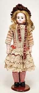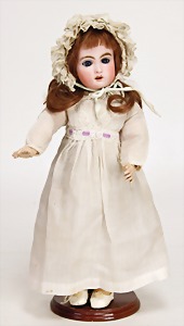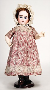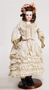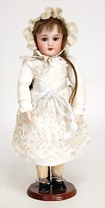 franz. Bébé, No. 2, gepresster Biskuit-Porzellan-Kurbelkopf, braune fest eingesetzte Paperweight-Augen, geschl. Mund, Kinngrübchen, durchst. Ohren, minim. Chip an 1 Ohrloch, Gliederkörper, mit 8 losen Kugeln, feste Handgelenke, alte Echthaarperücke, alte Kleidung, alte Jumeau-Schuhe, ausdrucksstark, schönes Porzellan