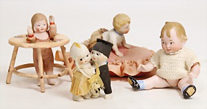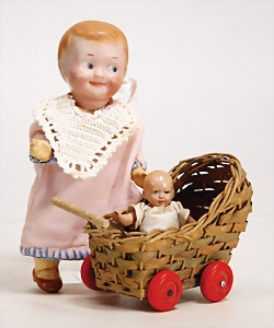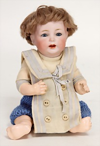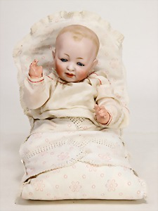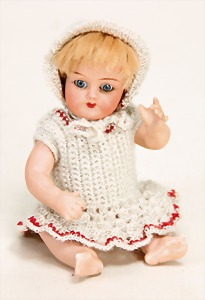 126, 12 cm, Biskuitkurbelkopf, blaue fest eingesetzte Augen, Mohairperücke wurde nicht entfernt, offener Mund, Ganzbiskuit - Sitzbabykörper, mit unterschiedl. Handhaltung, außergew. Gr.