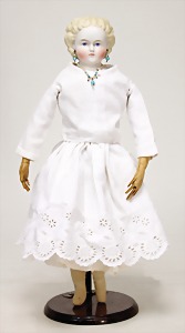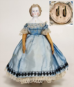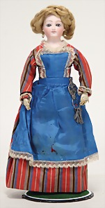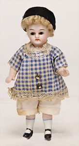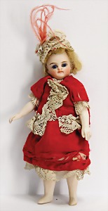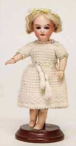 kl. Biskuitporzellankopf-Puppe, 21 cm, Kurbelkopf, blaue fest eingesetzte Glasaugen, off. Mund, oben Zähne, Masse-Stehkörper, anmodellierte Schuhe u. Strümpfe, Orig.-Kleidung u. –Unterkleidung, Perücke wurde nicht entfernt, von außen keine Risse erkennbar