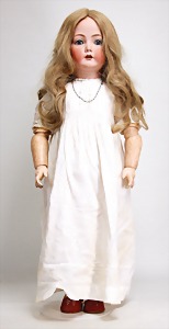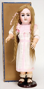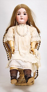 1361, 48 cm, blaue Schlafaugen, off. Mund, durchst. Nasenlöcher, Sitzbabykörper, mit bewegl. Handgelenken, alte Echthaarperücke, alte Schuhe