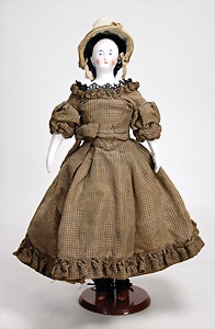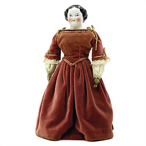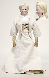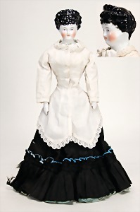 Puppe, ca. 1860, 50 cm, glasierter Brustblattkopf, fein ausmodellierte Haare mit Haarnetz, außergewöhnliche Frisur, blaue gemalte Augen, geschl. Mund, Stoffkörper, glasierte Arme u. Beine, aufgemalte Schuhe, alte Kleidung u. Unterkleidung, ausdrucksstark