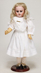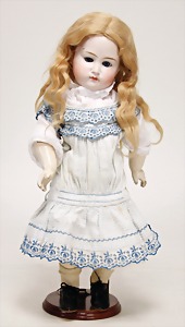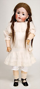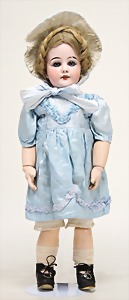 Simon & Halbig, Biskuitporzellankopf-Puppe, Kurbelkopf, blaue Schlafaugen, off. Mund, oben Zähne, Gliederkörper, alte Echthaarperücke, alte Kleidung u. Schuhe, Hände wohl 1 x überstrichen