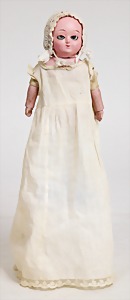 Wachsüberzogene Papiermaché-Puppe, 52 cm, stärker Rissbildung am Kopf, alte Mohairperücke ausgegangen, blaue Schlafaugen, Transportrisiko f. Augenmechanismus beachten, Stoffkörper, Massearme u. –beine, alte Kleidung