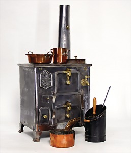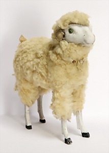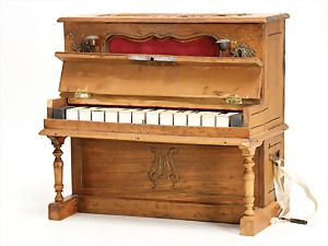 Puppen-Klavier, um 1900, Höhe 29 cm, ein paar Stellen am Holz ergänzt, vorne 2 Kerzenleuchter Messing/Blech, bespielbar, zusätzlich mit Musikspielwerk