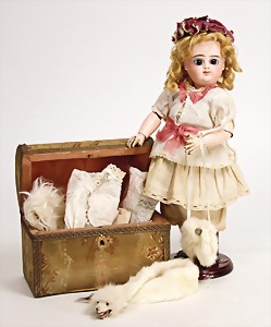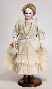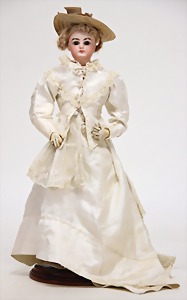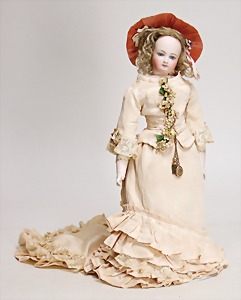 Biskuitporzellan-Brustblattkopf-Puppe, 39 cm, Biskuit-Brustblattkopf seitl. geneigt, braune Schlafaugen, geschl. Mund, Kinngrübchen, Gipsdeckel wurde nicht entfernt, Transportrisiko f. Augenmechanismus beachten, alte Echthaarperücke, Stoffkörper, Leder-Unterarme, alte Kleidung, Seide verschlissen, alte Schuhe, 1 Schnalle fehlt