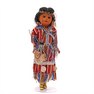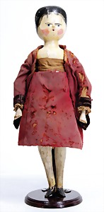Pumpkinhead (Kürbiskopf)-Puppe, Papiermaché, Brustblattkopf, Wachs überzogen, 40 cm, ausmodellierte Haare mit Haarreif, blaue Schlafaugen, an 1 Auge etwas ausgebessert, Gliederkörper, mit Holz/Masse -Armen u. -Beinen, Hand- u. Fußgelenke beweglich, Kleidung alt oder aus alten Stoffen genäht