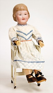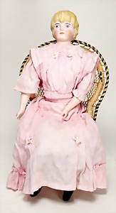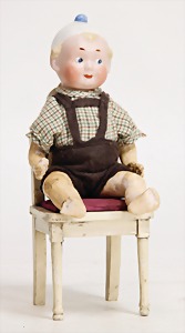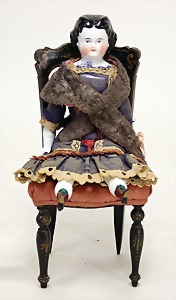 Puppe, 30 cm, glasierter Brustblatt-Kopf, glasierte Porzellan-Arme u. -Beine, ausmodellierte Stiefel, Orig.-Kleidung, mit passendem Stuhl