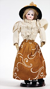 Modepuppe, Frankreich, 37 cm, Biskuit-Kurbelkopf, braune fest eingesetzte Glasaugen, geschl. Mund, auf Biskuit-Brustblatt, Mohairperücke, Lederkörper