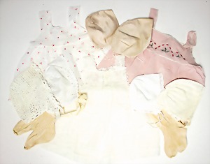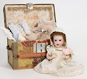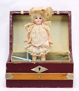 kl. Biskuit-Porzellankopf-Puppe, 13 cm, im Koffer, mit Kleidungsstücken, 1 Holzleiste lose
