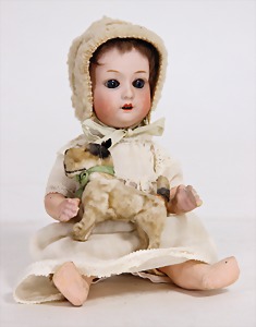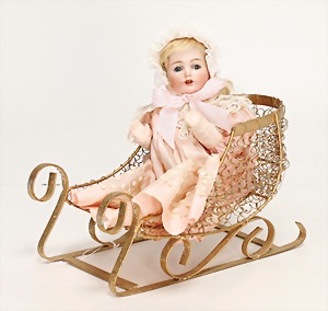257, kl. Biskuit-Porzellan-Charakterpuppe, 22 cm, Kurbelkopf, blaue Schlafaugen, off. Mund, oben Zähne, Zunge, Sitzbaby-Körper, untersch. Handhaltung, leicht abstehender Zeh, alte Mohair-Perücke, alte Kleidung, dazu 1 Blech-Schlitten