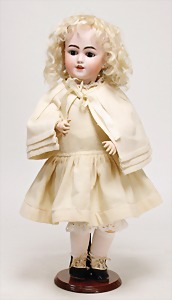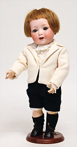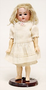Simon & Halbig, 101, Biskuitporzellan-Charakterpuppe, Biskuit-Kurbelkopf, blaue gemalte Augen, geschl. Mund, alte Echthaarperücke, Gliederkörper, alte Kleidung u. Unterkleidung, Schuhe u. Strümpfe, Perückenpull, minim. Abriebstelle an 1 Wange, 40 cm, Körper ein wenig zu klein zum Kopf, Größenbezeichnung 43 cm