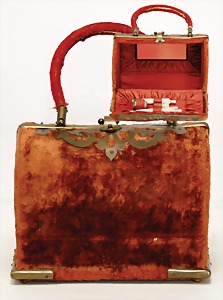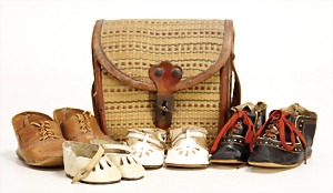 Kindertasche, ca. 1910, dazu 4 Paar Puppenschuhe, 5,5 – 9,5 cm, Leder u. Wachstuch
