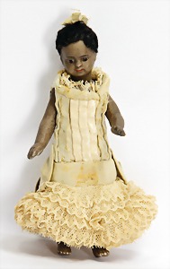 im Quadrat, Biskuitporzellan, Googly, 17,5 cm, Kurbelkopf, braune seitl. blickende Glasaugen, geschl. Mund, Mohairperücke, Masse-Stehkörper, alte Kleidung