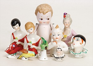 Heubach, Ernst, Puppenkopf, Marke an der hinteren Schulterplatte die Marke "260-14/0 / E.H.Germany / D.R.G.M.", Deutschland, Köppelsdorf (bei Sonneberg), ab 1914, Maße: 88 x 60 x 58 mm, Biskuitporzellan, guter Allgemeinzustand, Brustplatte hinten rechts mit Chip, an der rechten Schläfe dünne Risslinie mit winzigem Chip, Porzellanfabrik Rauenstein, Pariankopf, Brustkopf, Biskuitporzellan, "191 / 14", Deutschland, wohl Rauenstein (Thüringen), um 1895, Maße: 100 x 77 x 69 mm, guter Allgemeinzustand, senkrechter Riss an der vorderen Schulterplatte bis zur unteren Wange, feiner, horizontaler Glasurriss hinten auf der Schulterplatte