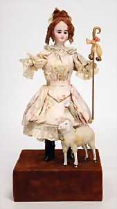 192, Biskuitporzellan-Kurbelkopf, braune Schlafaugen, off. Mund, oben Zähne, Laufkörper, gegliederte Arme, Kleidung alt o. aus alten Stoffen genäht, alte Mohairperücke, Uhrwerk intakt