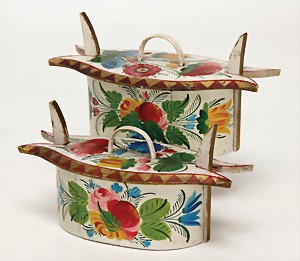 2 Kinder-Brotdosen, Span, Holz, bemalt, mit Blumendekor, Aufschrift „Sofie Sauer, Clara Sauer“, 22 cm, schöne Puppendekoration