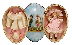 Papiermaché-Ei, mit Biskuitporzellankopf-Puppe, 12,5 cm, Kurbelkopf, fest eingesetzte blaue Glasaugen, off. Mund, oben Zähne, Mohairperücke, Orig.-Kleidung, Kleidung zusätzlich